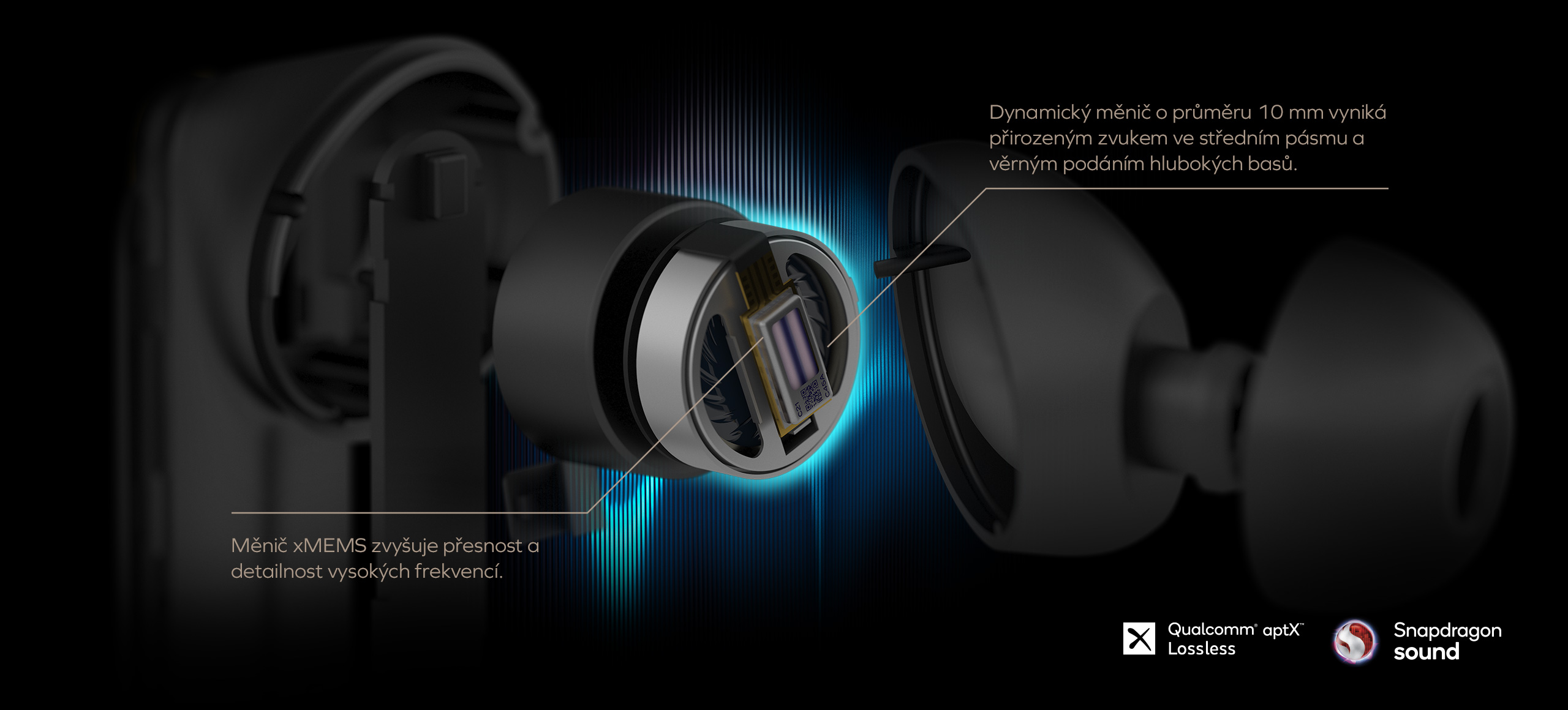 Ve spojení se systémem Qualcomm pro integraci technologie aptX Lossless Snapdragon Sound poskytuje zvukový kodek zvuk s vysokou věrností při 16 bitech / 44,1 kHz a zprostředkovává tak zážitek na úrovni disku CD, který věrně reprodukuje původní nahrávku přímo vám do uší.