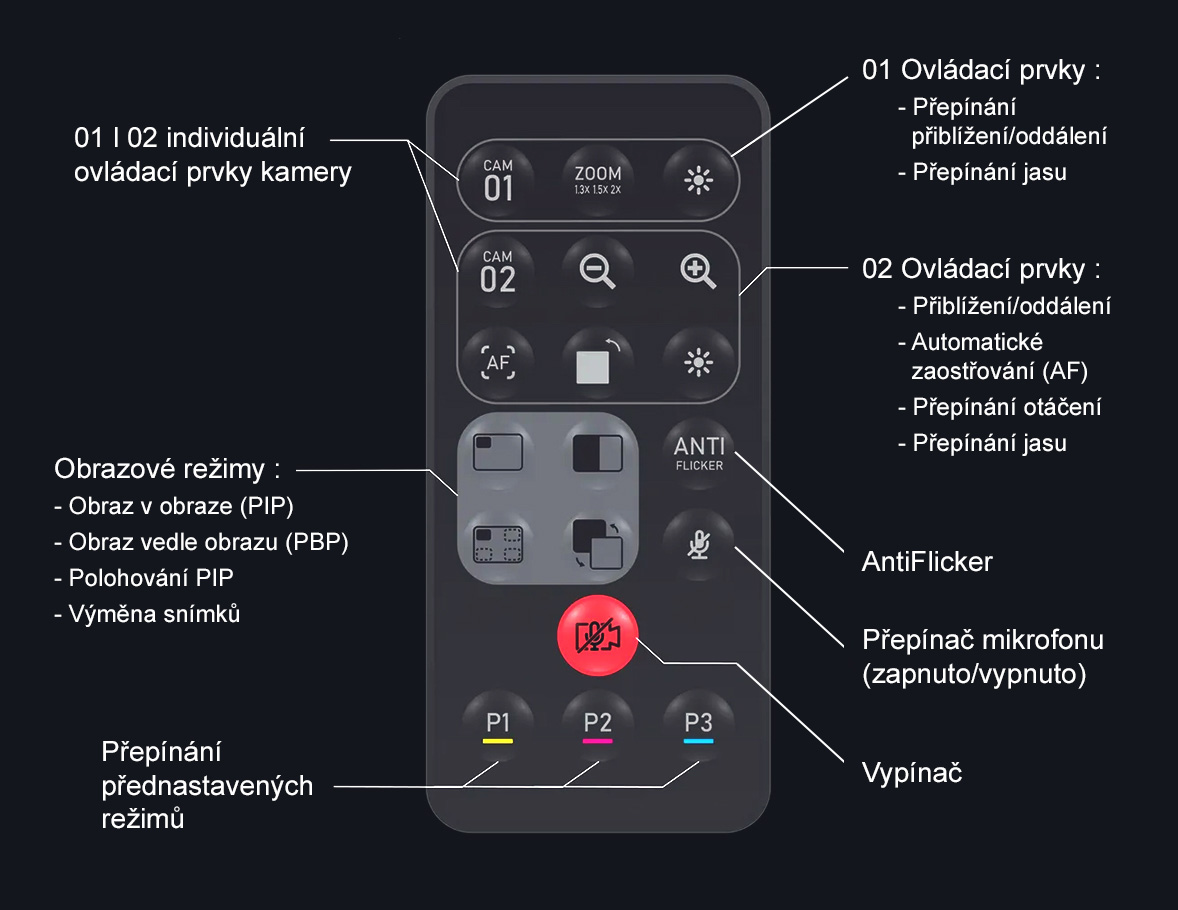 Zásluhou kombinace výkonu dvou kamer a našeho intuitivně navrženého infračerveného dálkového ovládání je nyní možné plynule přepínat z jednoho úhlu kamery na druhý stisknutím jediného tlačítka. Tahle funkce se hodí zejména pro tvůrce obsahu, kteří chtějí svým příznivcům poskytnout dynamičtější a profesionálnější zážitek ze sledování, a hodí se rovněž tvůrcům, kteří pořádají živé akce, jako jsou streamy her, živé rozhovory nebo prodejní show v reálném čase.